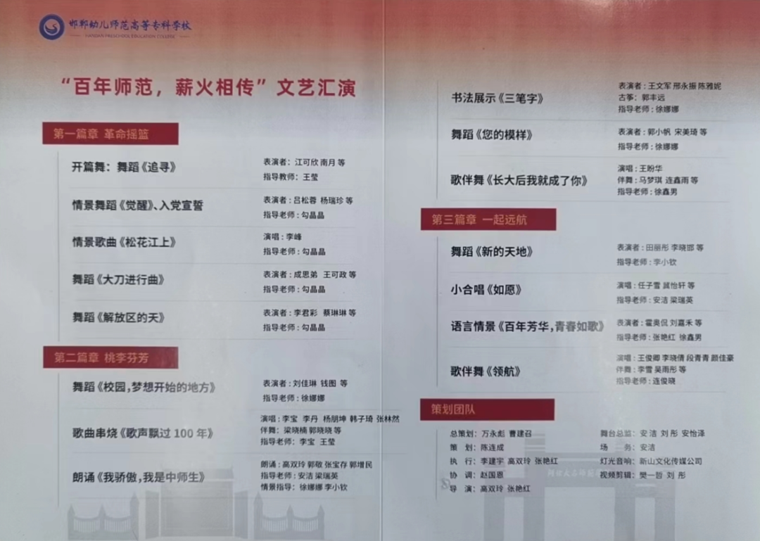邯郸幼儿师范高等专科学校庆祝建校100周年暨幼儿师范教育高质量发展大会系列活动之“百年师范 薪火相传”文艺汇报演出视频(点击观看直播回放↑)。