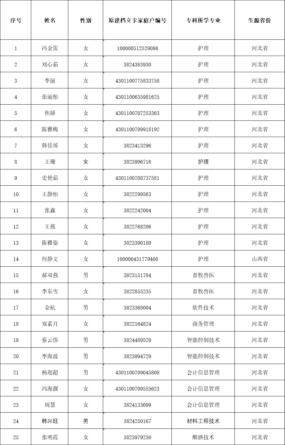 根据河北省教育厅关于做好《2024年河北省普通高等学校专升本考试招生工作的通知》和河北省招生委员会办公室关于《2024年河北省普通高等学校专升本考试招生实施办法》的通知要求,我院经过对原建档立卡贫困家庭应届高职(专科)毕业生的专升本资格审核,共有25名学生通过资格审核,现予以公示。名单如下: