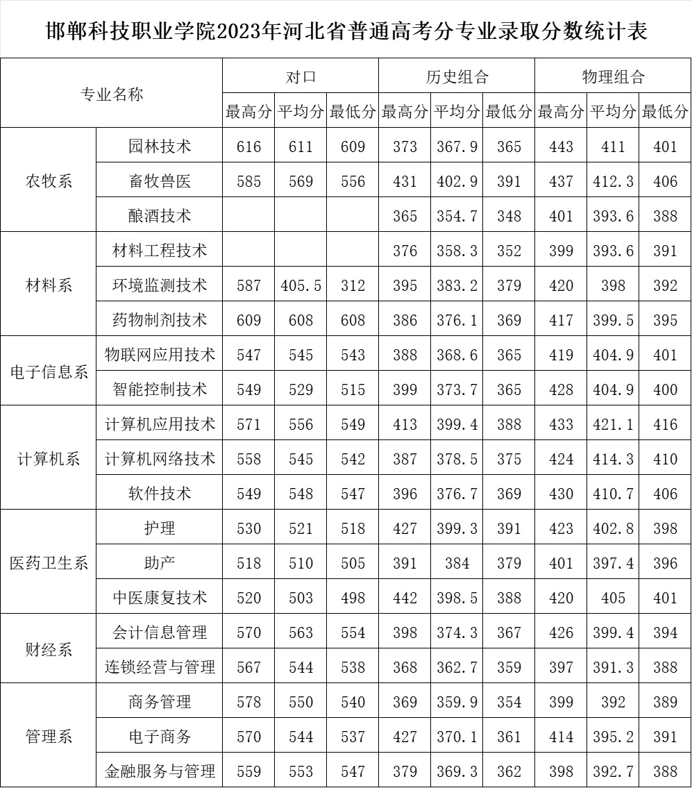 邯郸科技职业学院2023年河北省普通高考分专业录取分数统计表