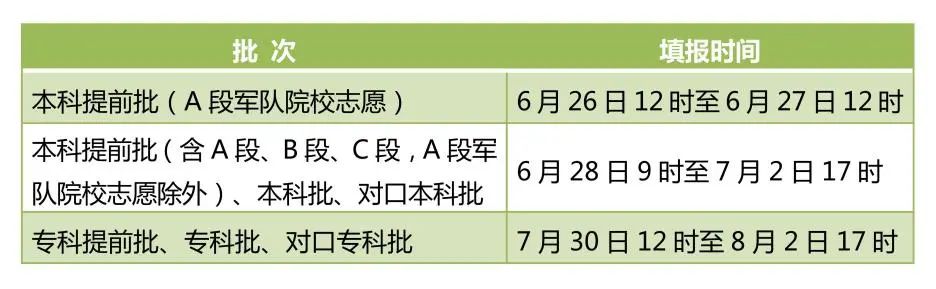 军队(含武警,下同)院校招生计划安排在本科提前批A段,实行顺序志愿投档,设1次集中填报志愿和1次征集志愿,考生每次可填报1所学校,每所学校设6个专业志愿和1个专业服从调剂选项。集中填报志愿时间为6月26日12时至6月27日12时。