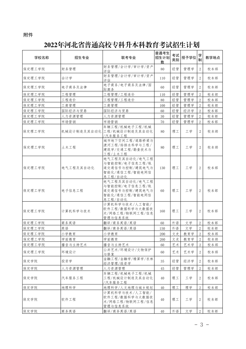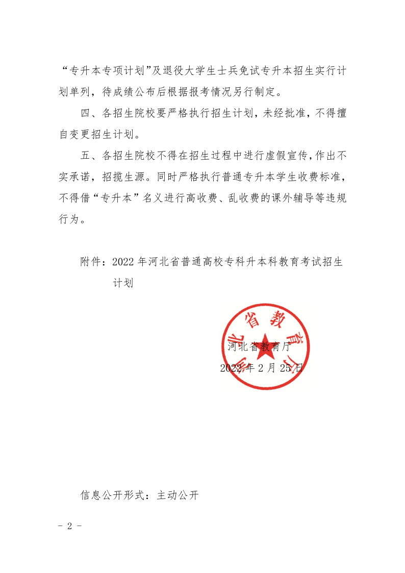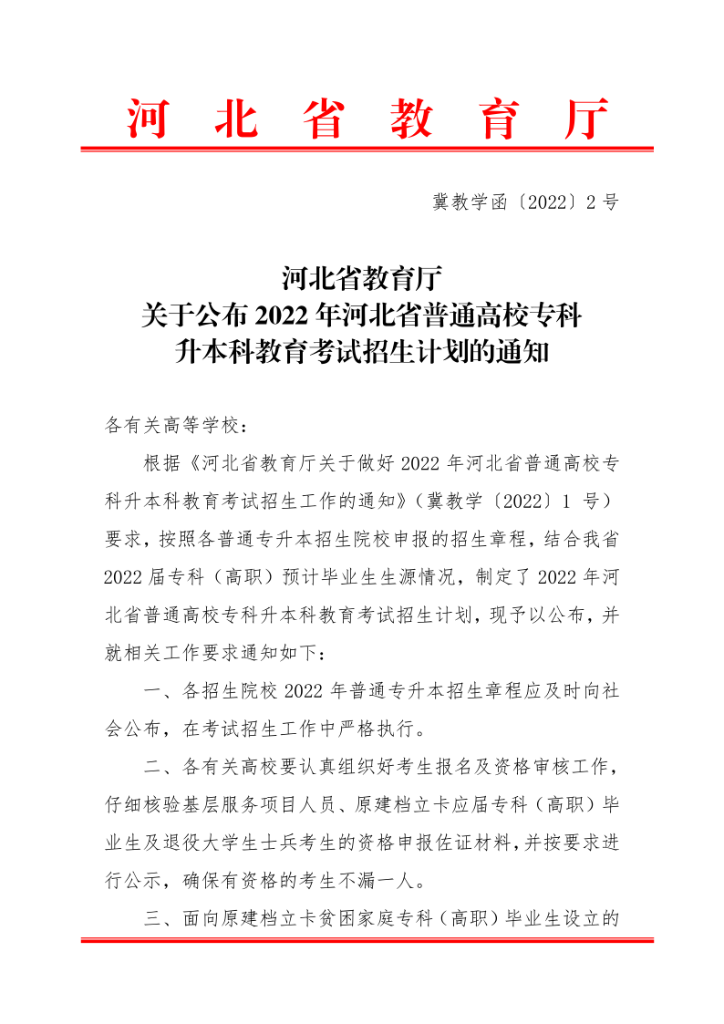 河北省教育厅关于公布2022年河北省普通高校专科升本科教育考试招生计划的通知(冀教学函[2022]2号)