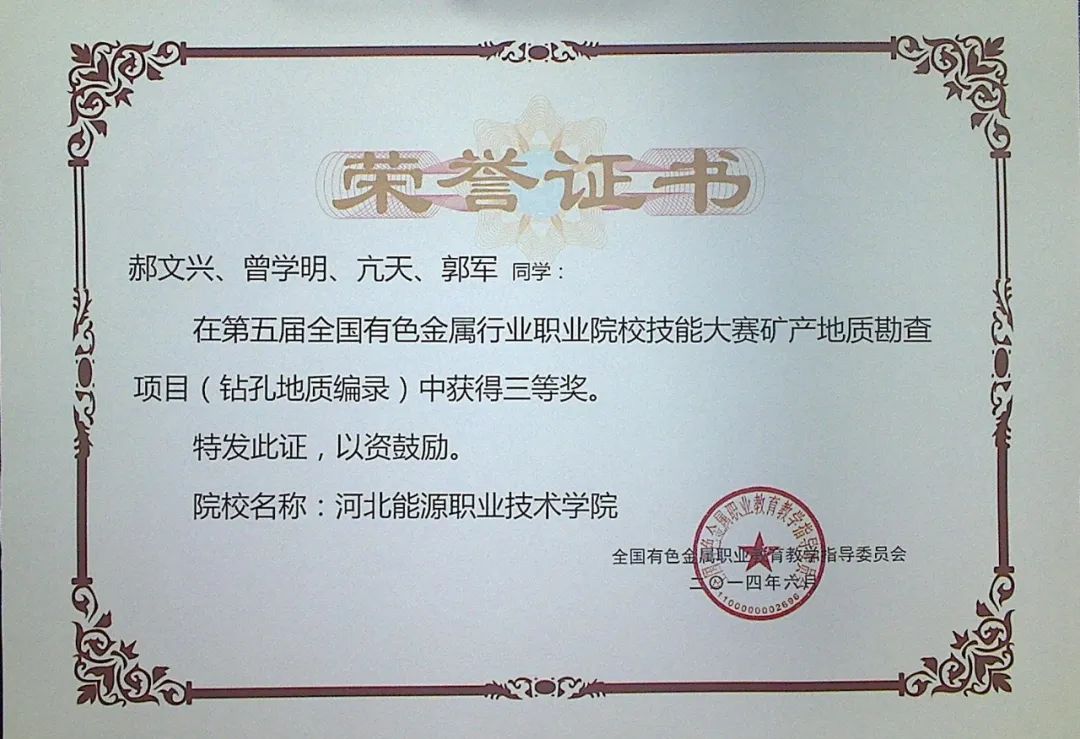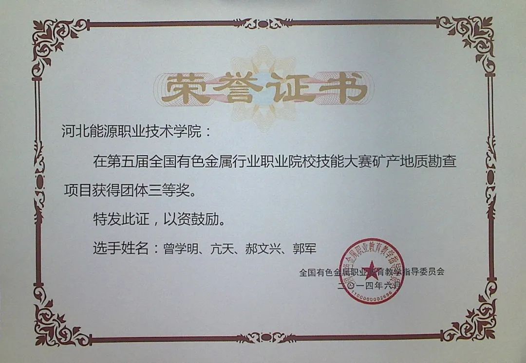 参加2014年全国第五届有色金属行业职业院校技能大赛获矿产地质勘查项目团体三等奖。
