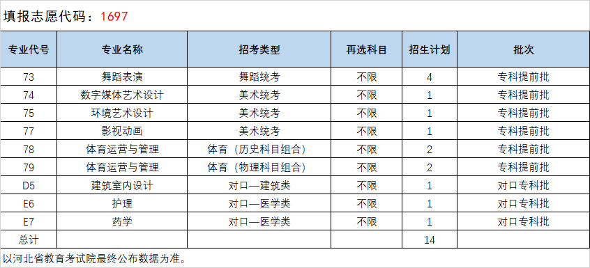 我院专科提前批和对口专科批征集志愿招生计划【河北省】