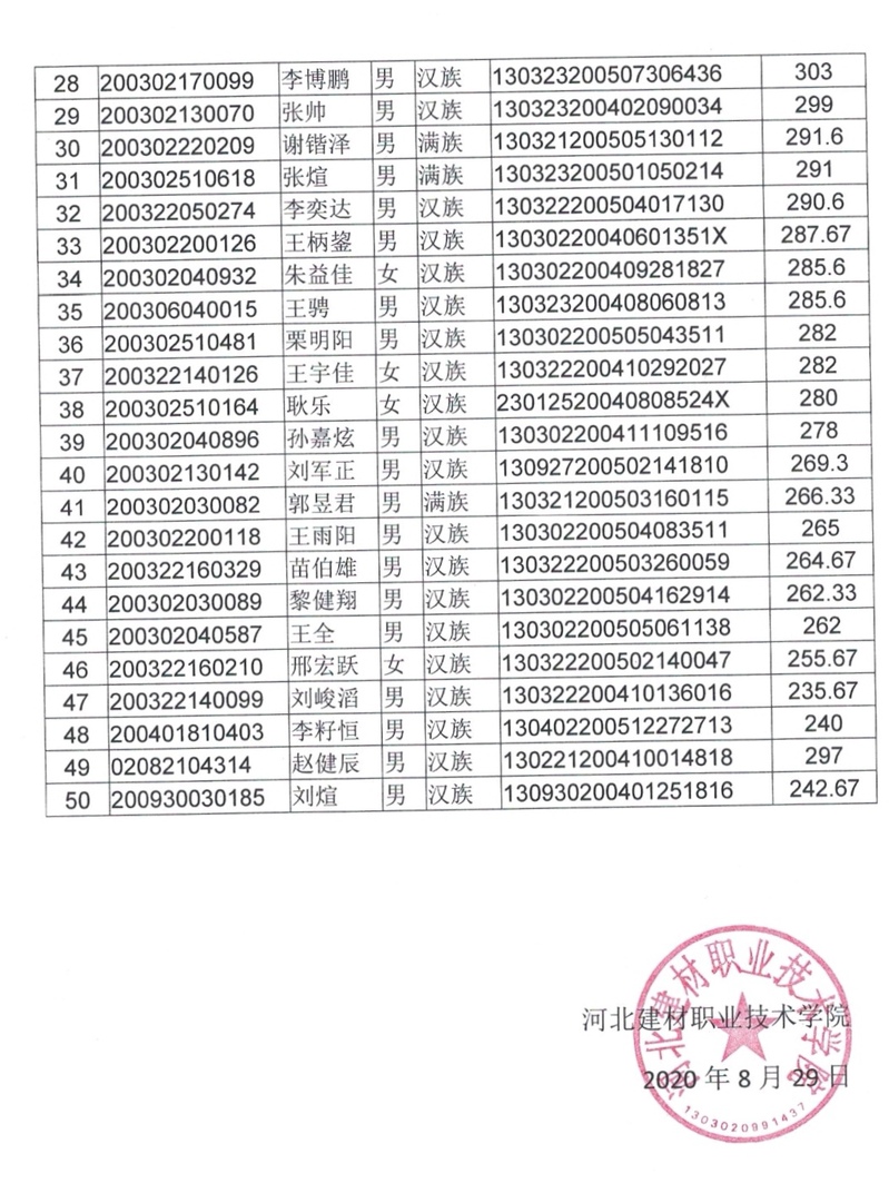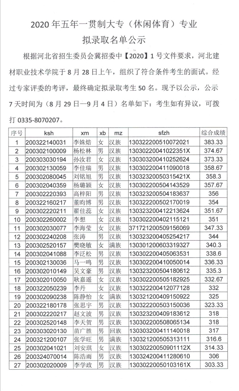 2020年五年一贯制大专(休闲体育专业)拟录取名单公示