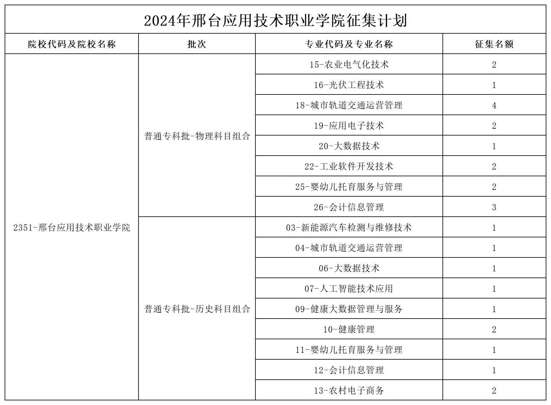 2024年邢台应用技术职业学院河北省专科批第一次征集计划
