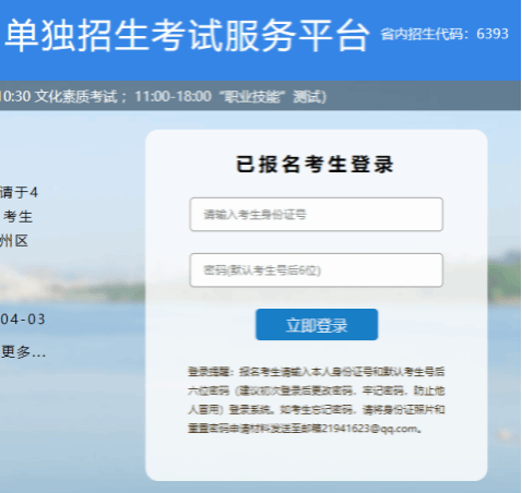 1.考生登录学校的单独招生考试服务平台:http://123.13.215.105:8000/。