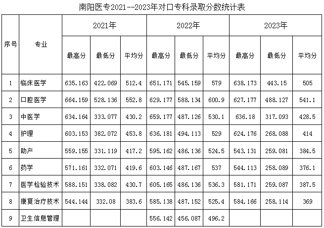 南阳医专2021--2023年对口专科录取分数统计表
