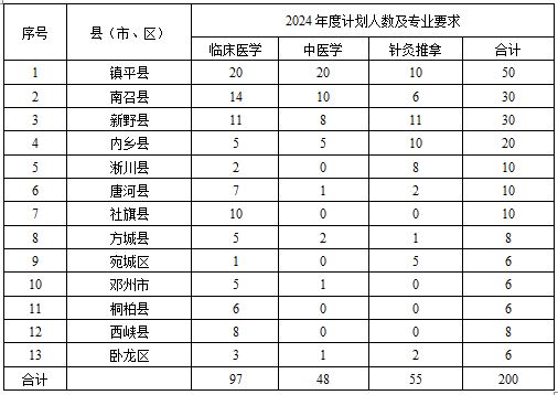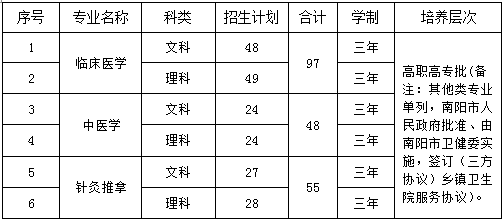 南阳市基层卫生人才培养临床医学、中医学、针灸推拿专业学生招生按照全省普通高考进行报名、考试和填报志愿。
