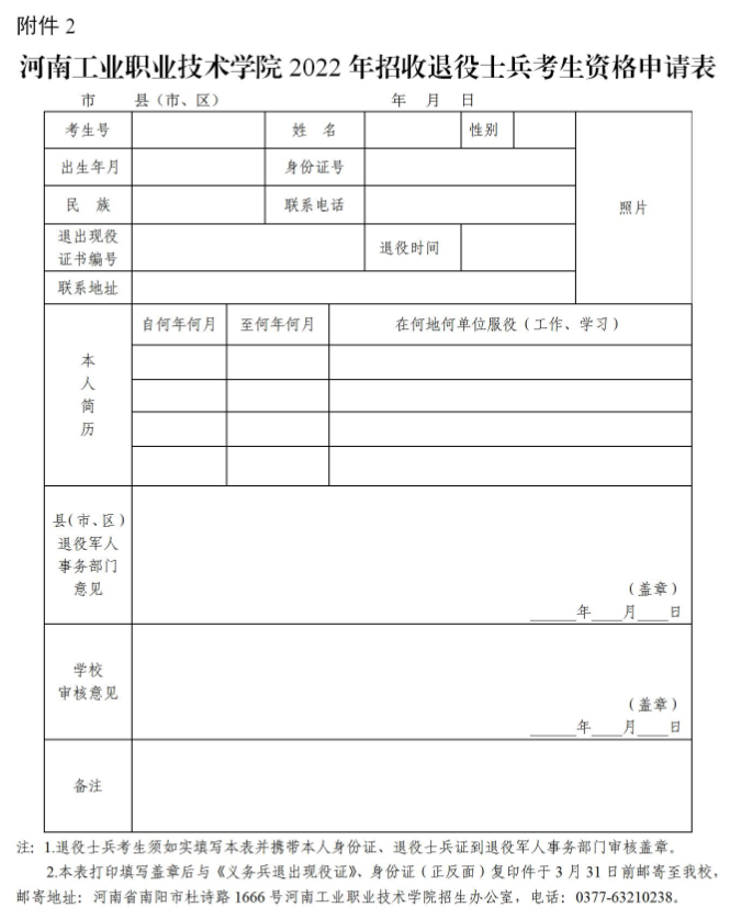 第一章 总 则 第一条 为切实做好2022年高等职业教育单独考试招生和技能拔尖人才免试入学工作,根据《河南省教育厅关于做好 2022 年高等职业教育单独考试招生和技能拔尖人才免试入学工作的通知》(教学〔2022〕59号)精神,结合当前新冠肺炎疫情防控常态化要求和学校实际,特制定本章程。 第二条 本章程仅适用于河南工业职业技术学院2022年高职单独考试招生工作。 第三条 学校单独考试招生工作严格遵守“十严禁”“30个不得”“八项基本要求”等规定,切实规范单独考试招生全过程,接受纪检监察部门、新闻媒体、考生及其家长以及社会各界的监督。 第二章 学校概况 第四条 学校全称:河南工业职业技术学院。 第五条 学校国标代码:12794,在豫招生代码:6262。 第六条 办学层次:高职(专科)。 第七条 办学类型:全日制公办普通高等学校。 第八条 办学地点:河南省南阳市杜诗路1666号(孔明路校区); 河南省南阳市工农路291号(光武路校区)。 第九条 颁发学历证书的学校名称:河南工业职业技术学院 证书种类:全日制普通高等学校专科毕业证书 第十条 学校简介 河南工业职业技术学院成立于1973年,是由河南省人民政府举办、省委军民融合发展委员会办公室(河南省国防科学技术工业局)管理的全日制普通高等学校,是国家骨干高职院校、国家优质高等职业院校、“中国特色高水平高职学校和专业建设”建设单位。 第三章 组织机构 第十一条 学校成立单独考试招生工作领导小组。由校长任组长,分管校领导任副组长,职能部门和有关教学单位负责人为成员。主要职责是:全面负责学校单独考试招生工作,制定招生政策,确定招生计划,拟定实施方案,决定单独考试招生的重大事宜。 第十二条 学校单独考试招生工作领导小组下设办公室。成员由学校相关职能部门和教学单位负责人组成。主要职责是:根据招生章程、方案和实施细则开展单独考试招生各项工作。 第十三条 学校纪检监察室为单独考试招生工作的校内监督机构。主要职责是:履行监督执纪问责职责,对单独考试招生工作全过程进行监督,接受考生举报并负责查实,监督举报电话:0377-63270283。 第四章 招生对象 第十四条 招生对象 1.已通过河南省2022年普通高校招生统一考试报名的考生; 2.已通过河南省2022年普通高校对口招收中等职业学校毕业生考试报名的考生(以下简称为中职类考生)。 第五章 招生专业及计划 第十五条 2022年学校单独考试招生专业及计划详见附表,学校可根据报考情况,调整招生计划。 第六章 志愿填报 第十六条 符合条件的考生应于2022年3月24日9时至3月26日18时登录“河南省普通高校招生考生服务平台”(https://pzwb.haeea.cn),按照河南省教育考试院的规定,完成志愿填报,我校报考代码为6262。 第七章 考 试 第十七条 考试须知 1.打印准考证:报考我校2022年高职单招的考生,需于4月7日9时至4月9日18时,登录我校招生信息网打印准考证(具体操作方法见网站操作说明)。 2.考试时间:4月9日(具体时间及要求以准考证为准)。 3.考试地点:河南工业职业技术学院孔明路校区。 第十八条 考核评价办法 (一)有“普通高中学业水平考试等级成绩”的文、理科考生(以下简称普高类考生) 1.文化素质考试 文化素质考试成绩采用普通高中学业水平考试等级成绩中的“语文、数学、英语”三科等级成绩折算出来的数值为分数,合计满分分值200分。 其文化素质考试折算公式如下: 文化素质考试成绩=(语文等级成绩+数学等级成绩+外语等级成绩),各等级成绩为普通高中学业水平考试成绩,其中语文、数学等级成绩A、B、C、D、E对应折算为70分、63分、55分、48分、33分,外语等级成绩A、B、C、D、E对应折算为60分、54分、47分、41分、28分。 2.职业适应性测试 职业适应性测试由我校单独命题并组织测试。采取笔试+面试方式进行,笔试时间为4月9日12:00—13:00,面试时间为4月9日9:00—18:30,笔试和面试各为150分,两项分值合计满分300分,笔试测试汉字书写及文字表达能力、职业道德、职业初步认知、三观(世界观、人生观、价值观)认知等,面试测试内容包括语言表达能力、创新思辨能力、分析和解决问题的能力。 (二)无“普通高中学业水平考试等级成绩”的文、理科考生(以下简称社会考生) 1.文化素质考试 文化素质考试由我校单独命题并组织考试。考试时间为4月9日13:30——15:00,考试科目为语文(分值70)、数学(分值70)、英语(分值60),合计分值200分。 2.职业适应性测试 职业适应性测试由我校单独命题并组织测试。采取笔试+面试方式进行,笔试时间为4月9日12:00—13:00,面试时间为4月9日9:00—18:30,笔试和面试各为150分,两项分值合计满分300分,笔试测试汉字书写及文字表达能力、职业道德、职业初步认知、三观(世界观、人生观、价值观)认知等,面试测试内容包括语言表达能力、创新思辨能力、分析和解决问题的能力。 (三)中职类考生 1.文化素质考试 文化素质考试由我校单独命题并组织考试。考试时间为4月9日13:30——15:00,考试科目为语文(分值70)、数学(分值70)、英语(分值60),合计分值200分。 2.职业技能测试 职业技能测试由我校组织现场实操测试。测试时间为4月9日10:00——18:30,分值300分。主要考察考生的语言表达能力、创新思辨能力、分析和解决问题能力、职业道德、职业认知、技能实际操作能力等。 (四)退役士兵