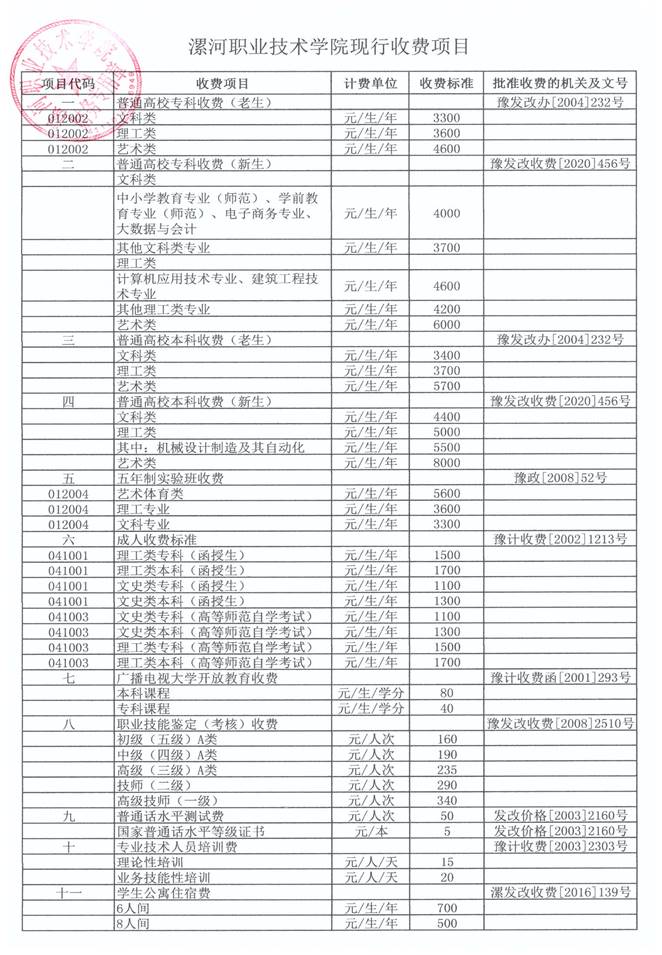 漯河职业技术学院2022年现行收费项目.docx