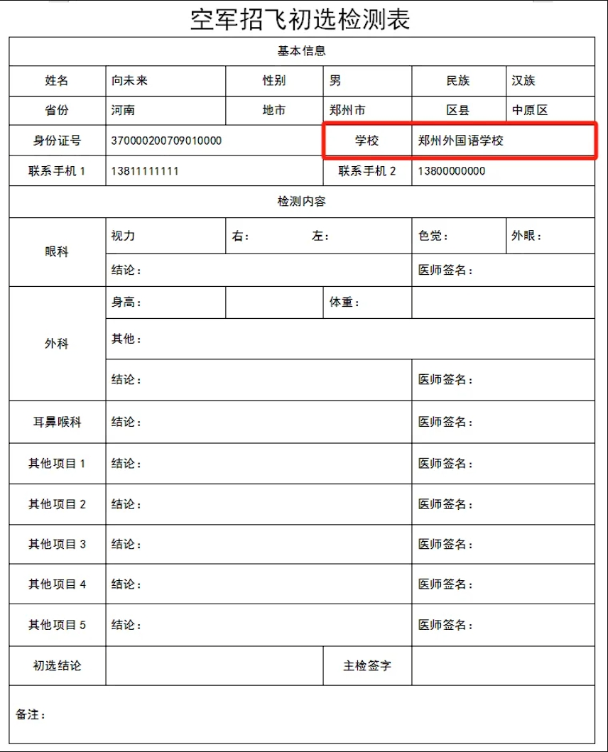 1. 学生参加初选检测须携带:身份证(或户口本)、《初选检测表》(“招飞智询”小程序自动生成,A4纸打印),无需缴纳任何费用。如错过当地检测,可就近就便到其他地市参检。报名后如学校未统一组织上站体检,请按发布的时间地点自行前往体检,中心不再对报名学生单独通知。2. 初选检测科目为眼科、外科、耳鼻喉科,学生参检前注意保护和恢复视力,搞好个人卫生(洗澡、修剪指甲、清理耳道),检测当天无需空腹,可正常进餐。3. 初选检测计划如有调整,以“空军济南招飞”微信公众号发布消息为准,联系电话:0531-51655310、51655311、51655312。