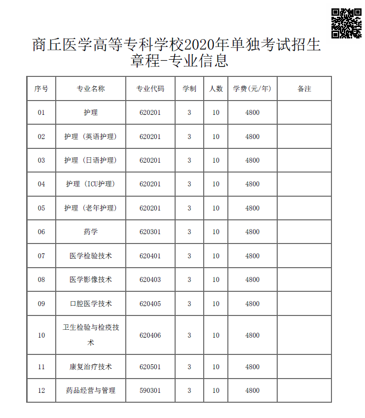 商丘医学高等专科学校2020年单独考试招生专业及计划