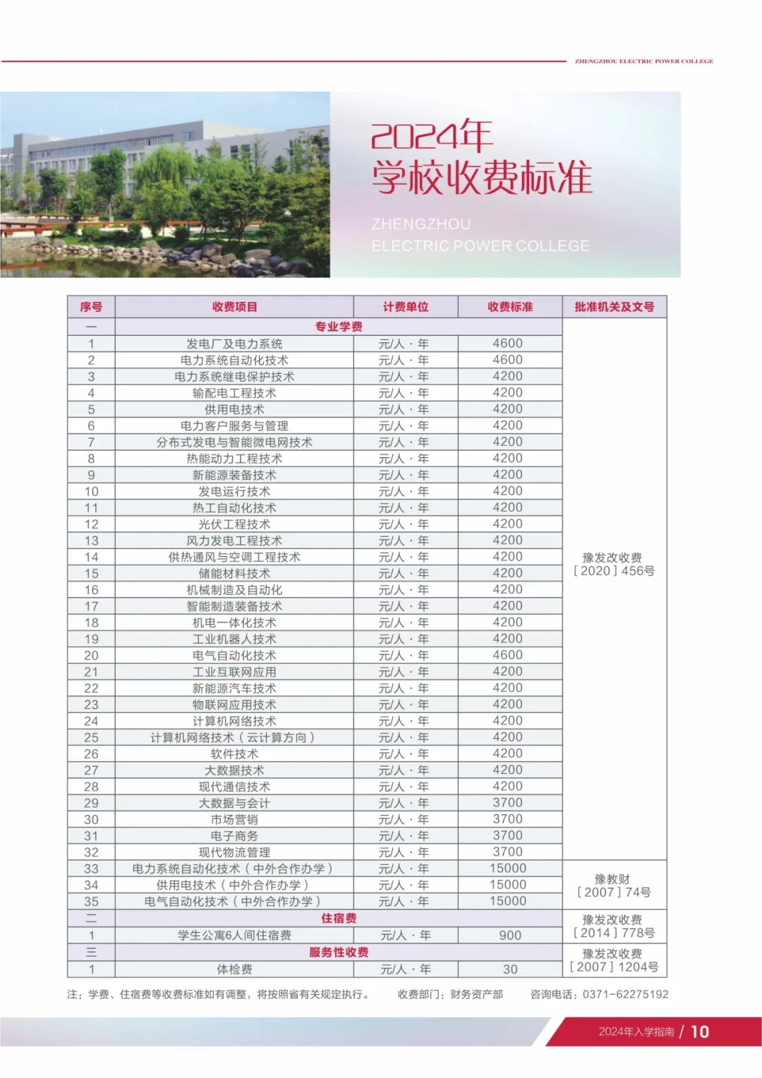 3.体检费:入学体检项目包括内外科、五官科、胸透、肝功能。收费标准为每生30元(豫发改收费[2007]1204号《关于规范普通高校新生入学体检收费标准的通知》),体检时缴纳。