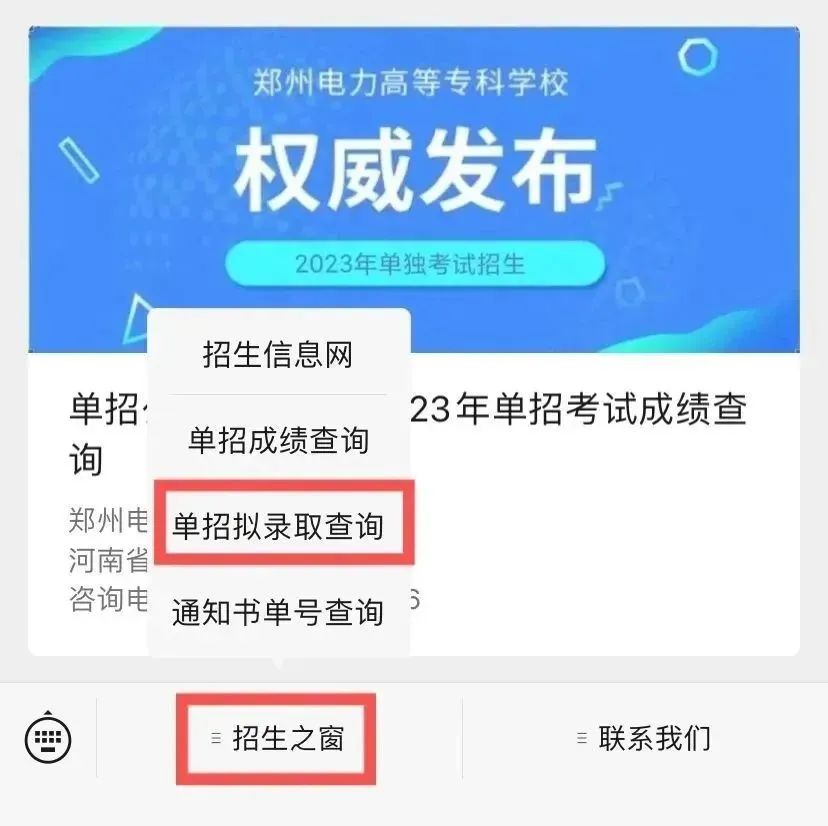 进入“郑州电力高专招生”微信公众号,通过左下方“招生之窗”进入“单招拟录取查询”,输入身份证号及考生号查询拟录取结果。