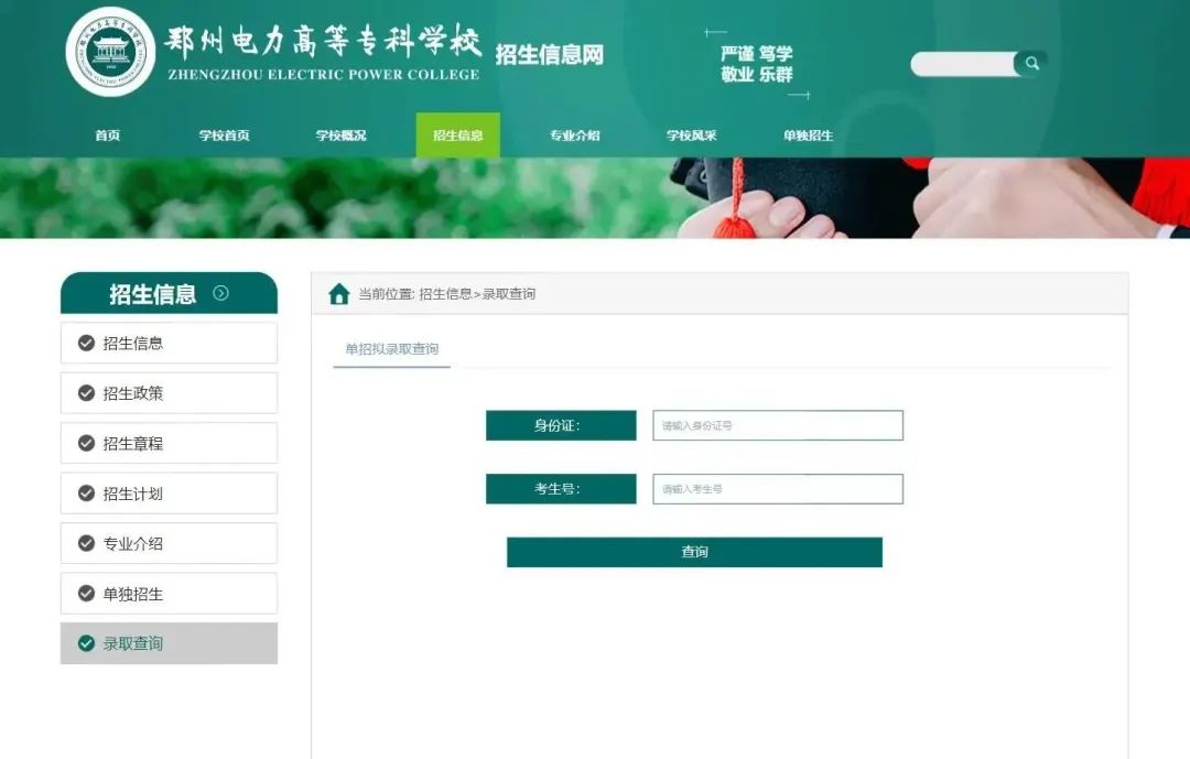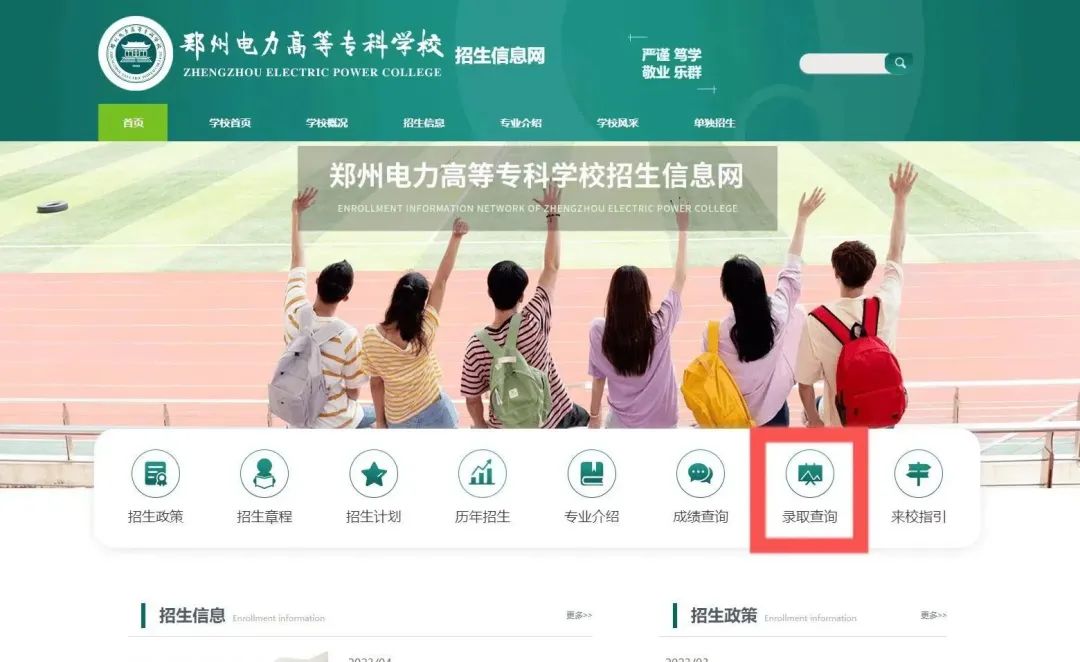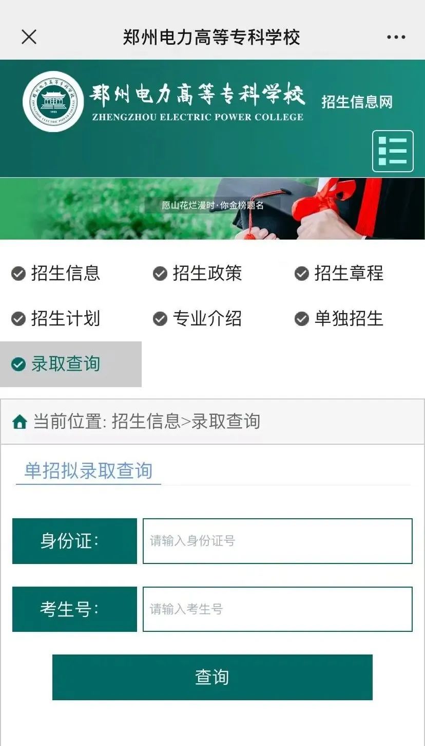 进入郑州电力高等专科学校招生信息网,点击首页“录取查询”-“单招拟录取查询”,输入身份证号及考生号查询拟录取结果。