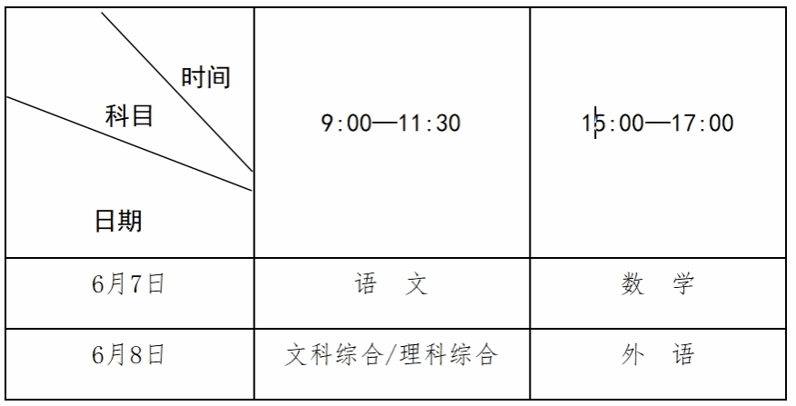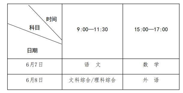 今年全国统考于6月7、8日举行,我省高考科目设置为“3+文科综合/理科综合”。“3”为语文、数学、外语(含听力),是考生必考科目;文科综合(包括政治、历史、地理)和理科综合(包括物理、化学、生物),由考生根据本人情况选考其一。“文科综合/理科综合”每科满分为 300分,其他各科满分均为 150 分,总分满分为 750 分。报考体育、艺术类专业的考生,除参加文化科目考试外,还须通过相应的专业考试,专业考试由省教育考试院和相关高校组织安排。
