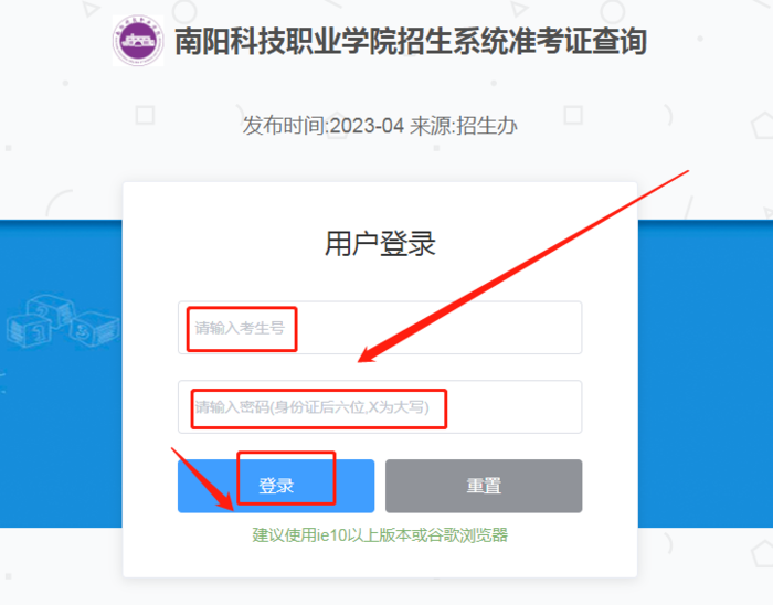 2、准考证打印入口:南阳科技职业学院官网首页浮动的红色浮标(2023年高职单招打印准考证入口),或直接打开http://117.158.67.130:8089/stu/#/login。
