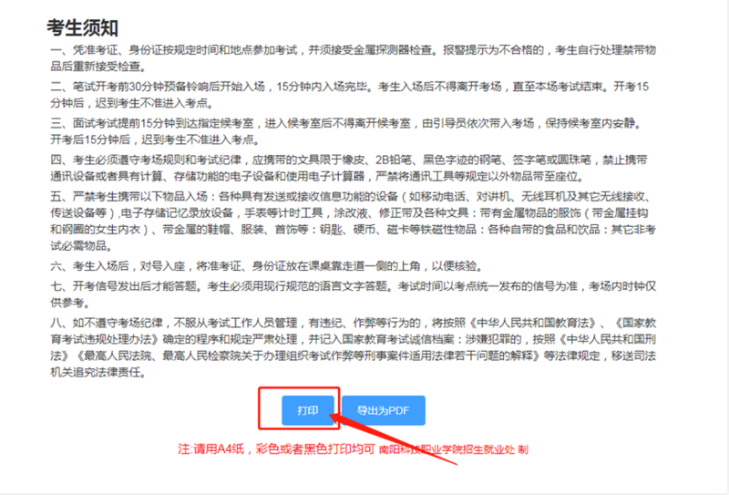 ④认真阅读考生须知,页面拉至最低端点击“打印”,打印准考证。