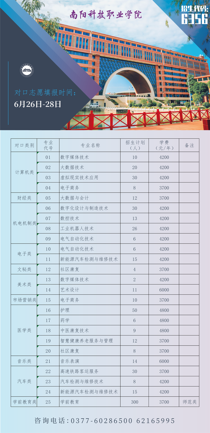 南阳科技职业学院2022年对口批次及高职高专批次专业代号