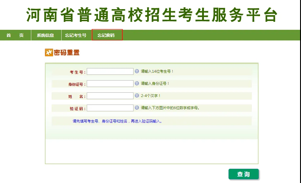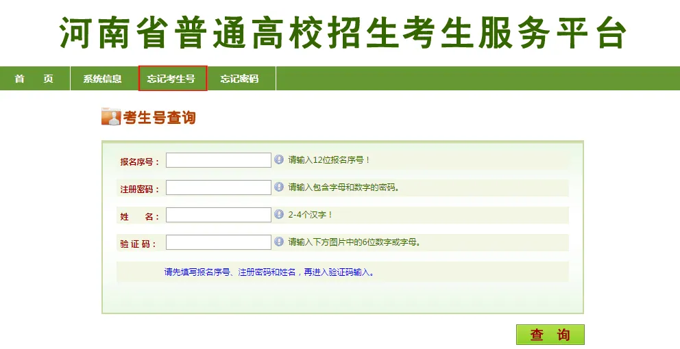 4、如果考生忘记自己的考生号和密码可以通过菜单栏的“忘记考生号”和“忘记密码”菜单项找回自己的考生号和重置自己的密码(找回考生号需要报名注册时的12位报名序号和注册密码,如果这些信息找不到,可以查看个人报名信息登记表,上面也载有考生号,实在找不到请联系学校或老师)。如下图:
