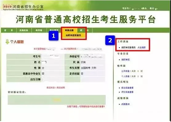 2、登录普通高招服务平台后,点击菜单栏的“填报志愿”菜单项,下拉菜单显示出“高职单招”的志愿。或者通过工作进度栏的“点击填报”直接进入填报页面。如下图: