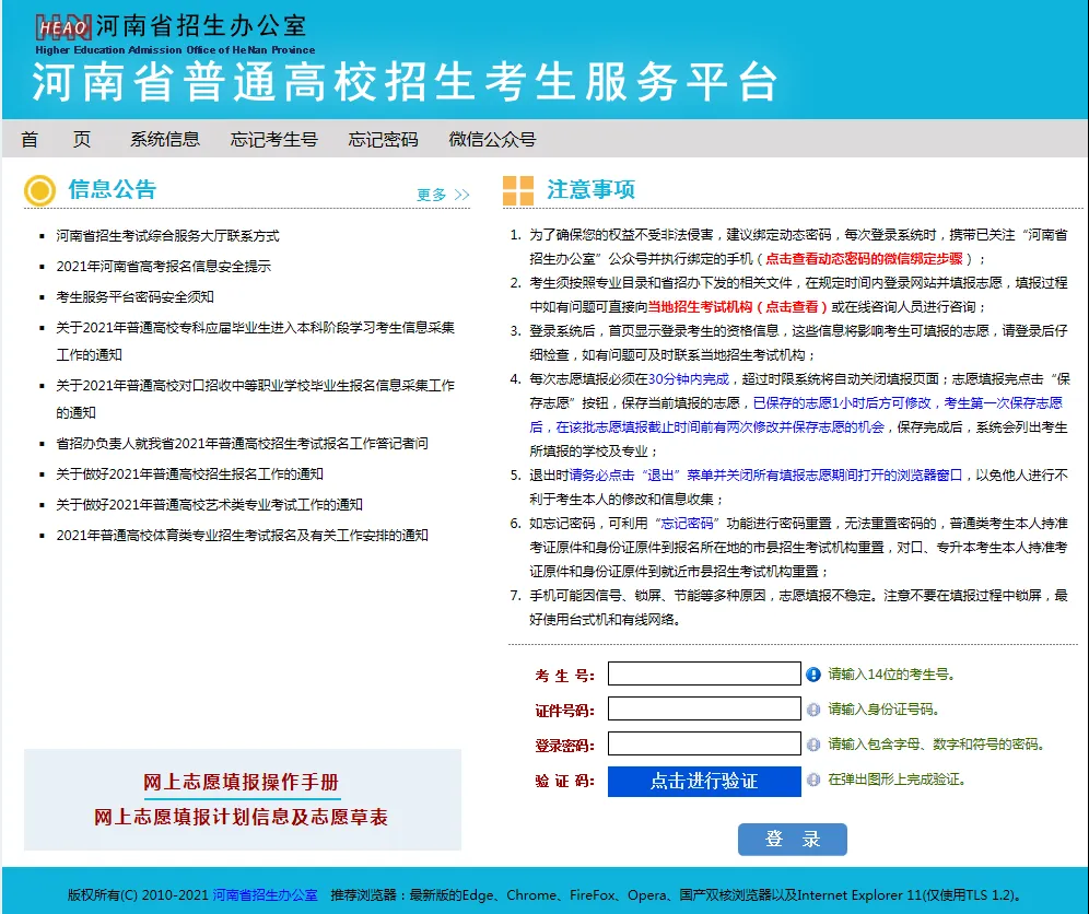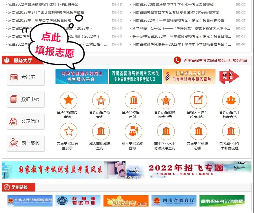 1、登录河南省教育考试院网站(http://www.haeea.cn/),选择网上服务大厅栏的“网上志愿填报”(与网上报名是同一平台)链接,进入系统。或者直接访问河南省普通高校招生考生服务平台(https://pzwb.haeea.cn/)。