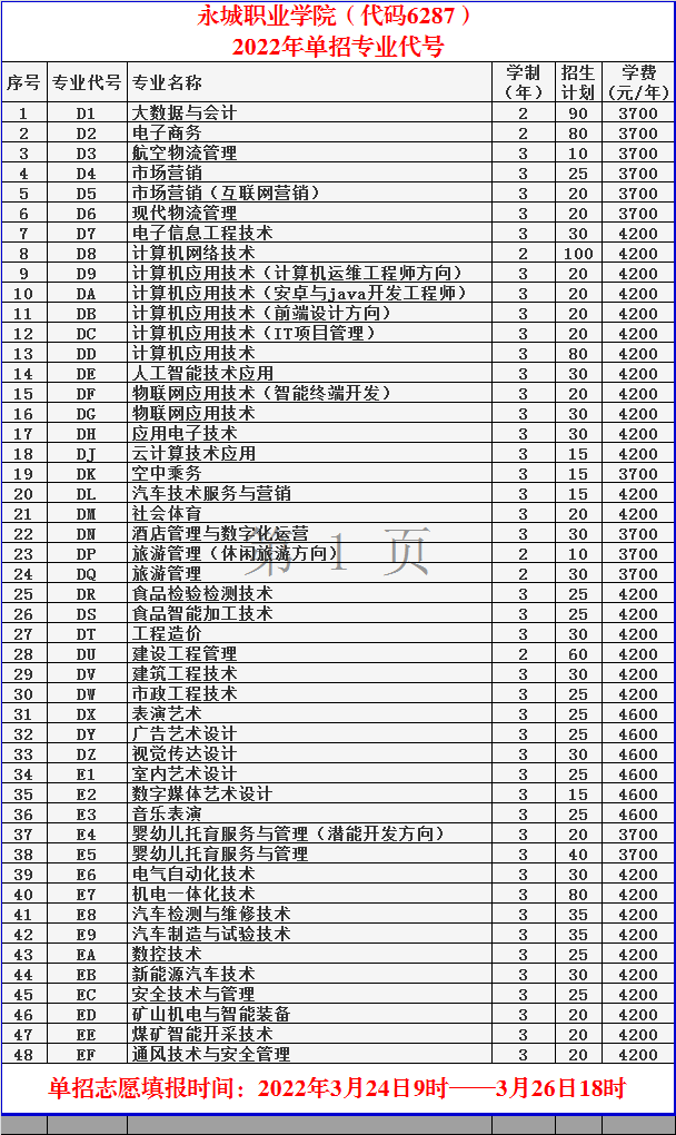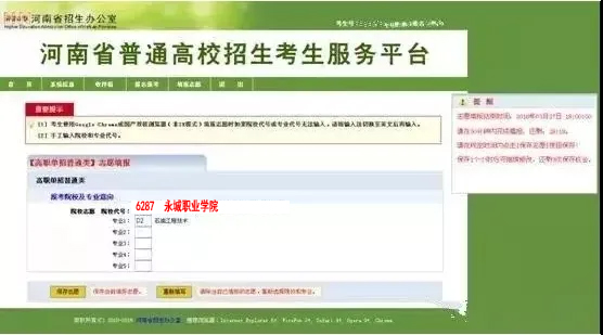 填写院校:输入【6287】永城职业学院院校代码,输入要填报的专业代号,系统会自动显示专业名称。