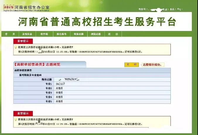 4、志愿保存成功后,系统自动跳转到志愿信息浏览页面,显示考生已经填报的志愿信息,考生可以点击打印按钮打印志愿信息。