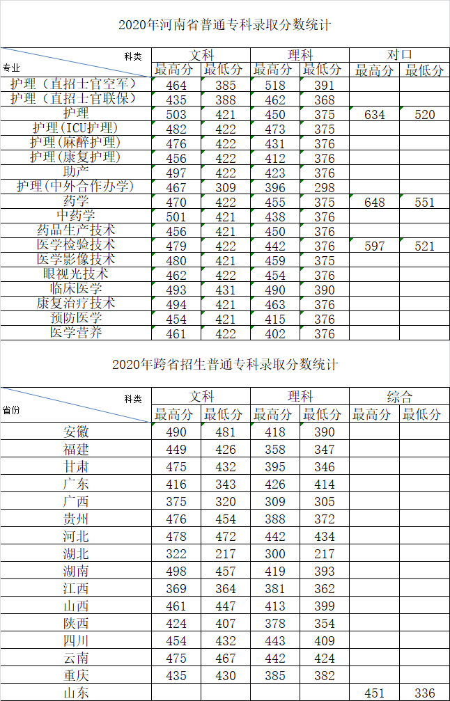 2020年普通专科招生录取分数统计