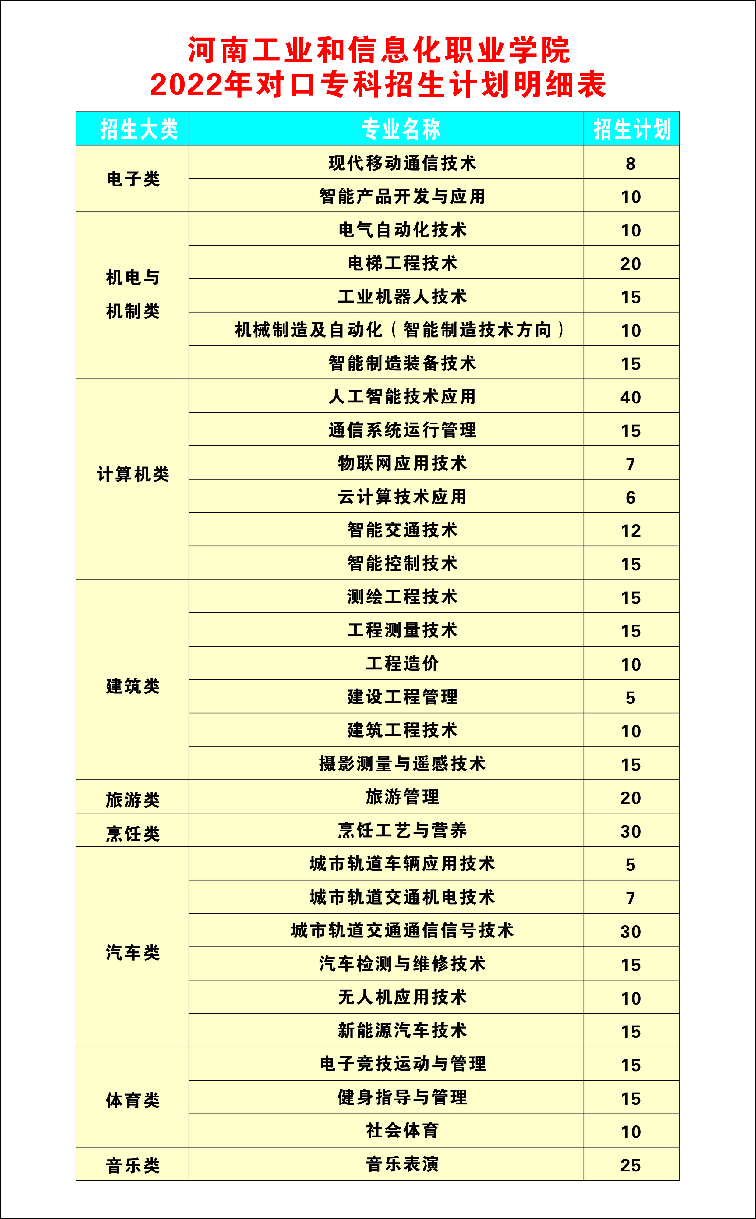 河南工业和信息化职业学院2022年对口专科招生计划