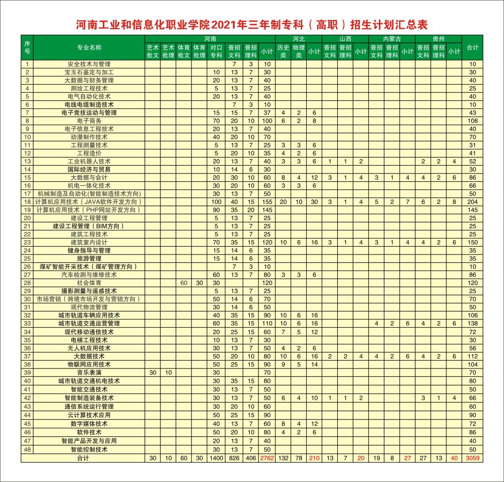河南工业和信息化职业学院2021年专科(高职)招生计划
