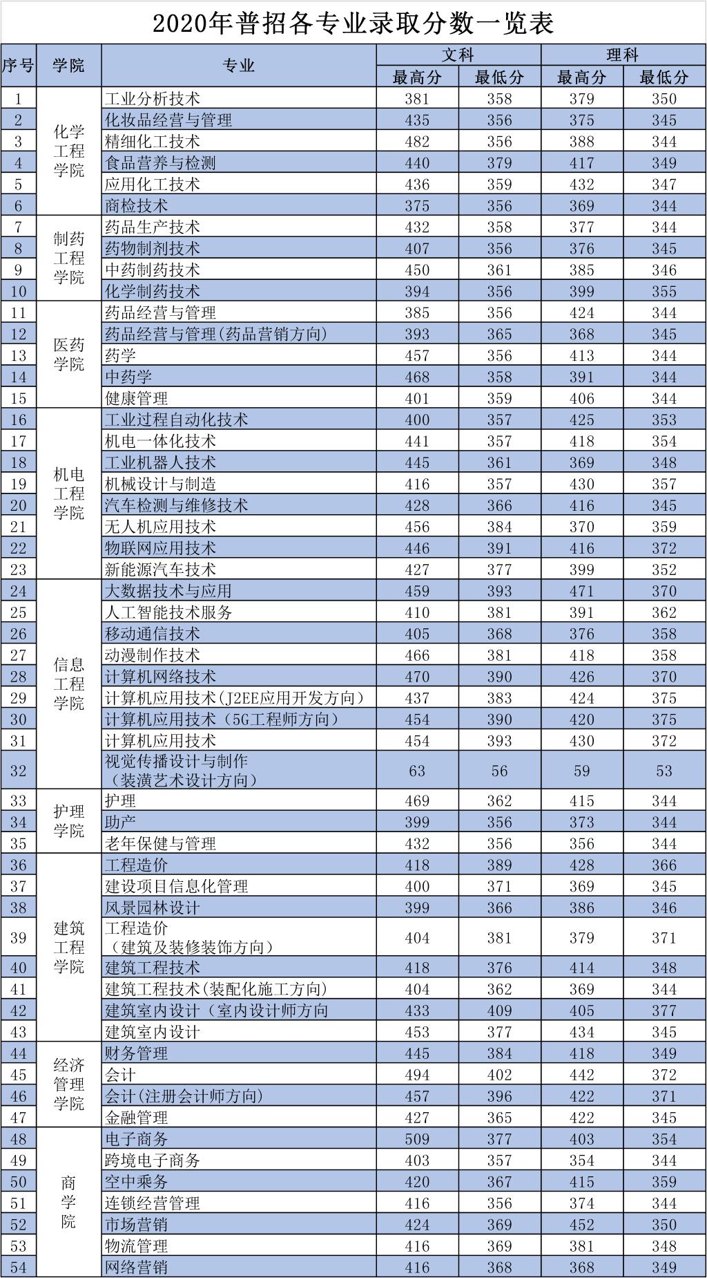 2020年普招各专业录取分数一览表
