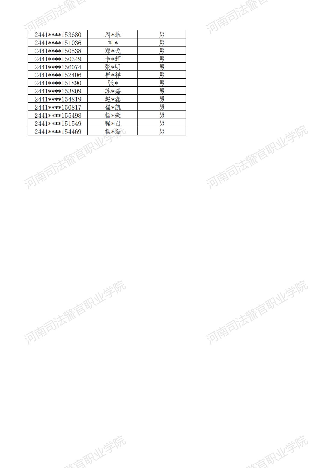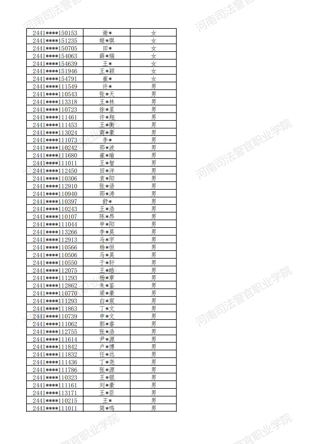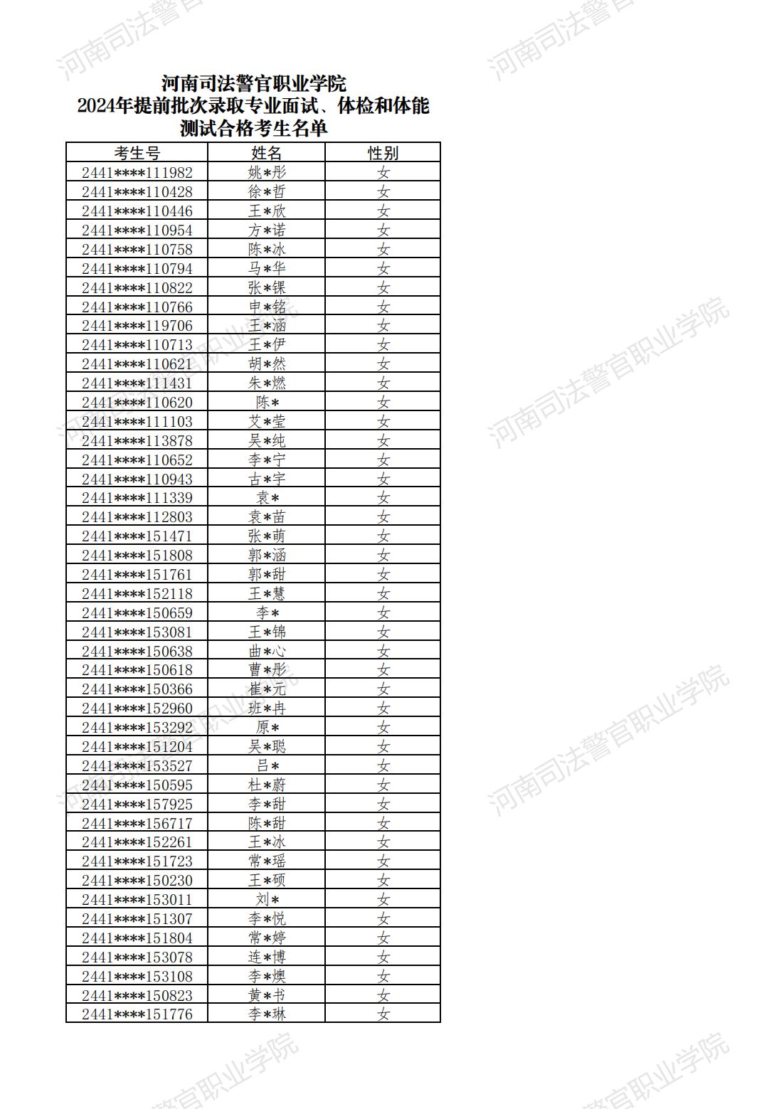 河南司法警官职业学院2024年提前批次面试、体检和体能测试合格名单