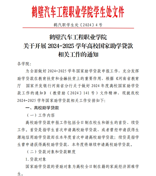 鹤壁汽车工程职业学院 关于开展 2024-2025学年高校国家助学贷款相关工作的通知