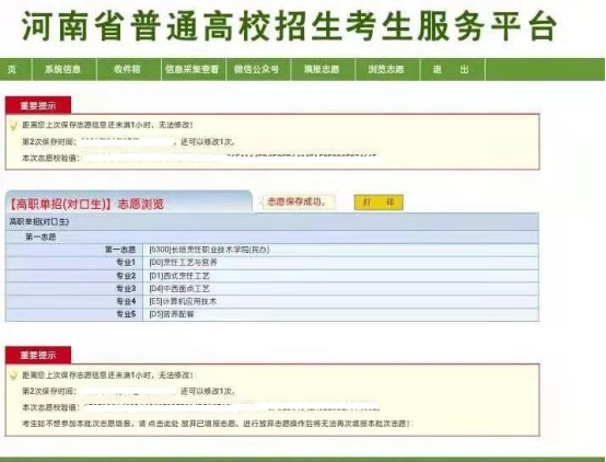 志愿保存成功后,系统自动跳转到志愿信息浏览页面,显示考生已经填报的志愿信息,考生可以点击打印按钮打印志愿信息。