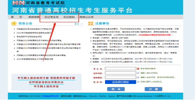 进入考生服务平台后,请仔细阅读“信息公告”区、“注意事项”区发布的政策公告和注意事项。