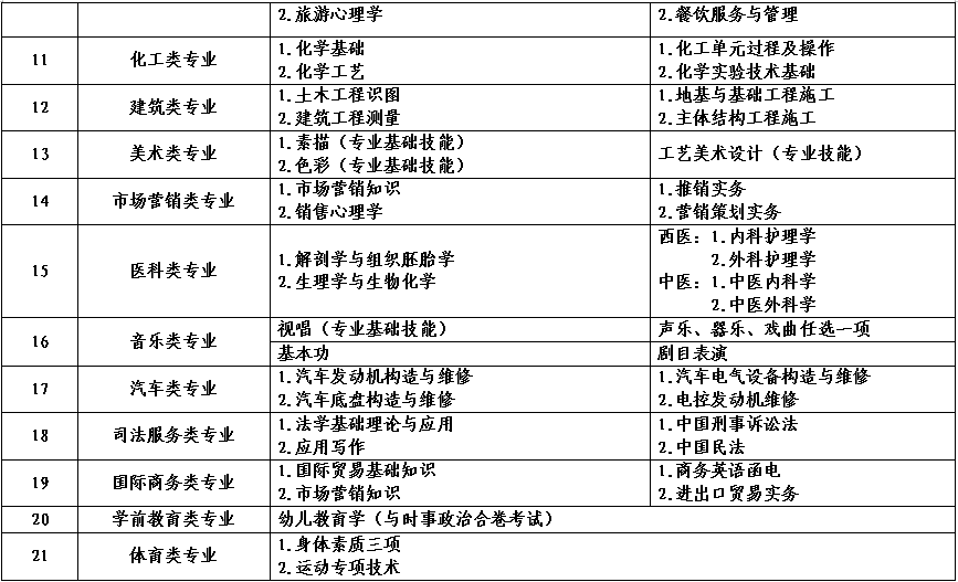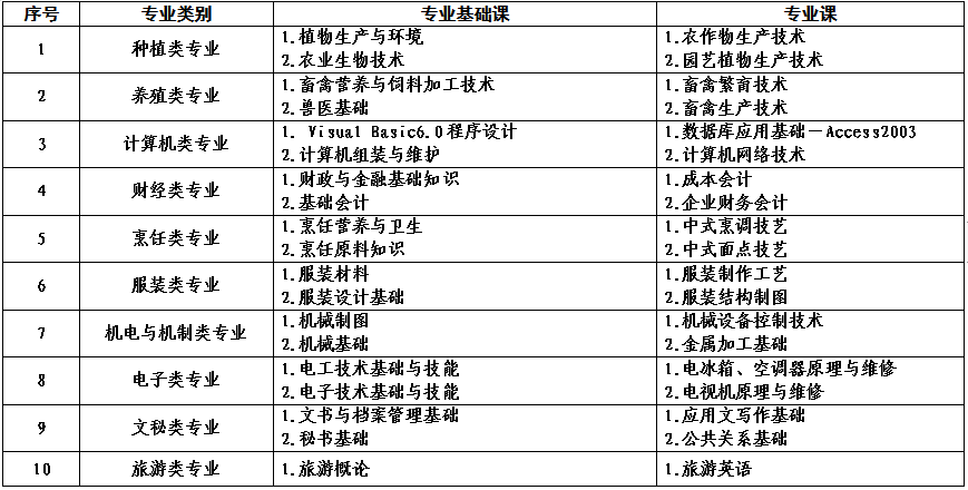 河南省2022年对口招收中等职业学校毕业生进入普通高等学校学习专业基础课和专业课考试科目表