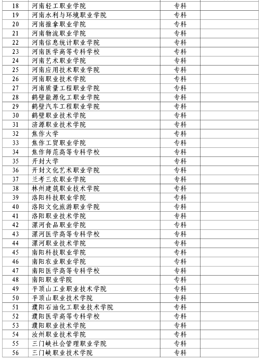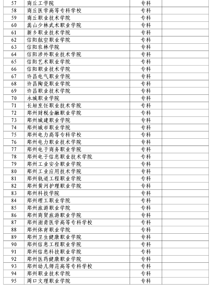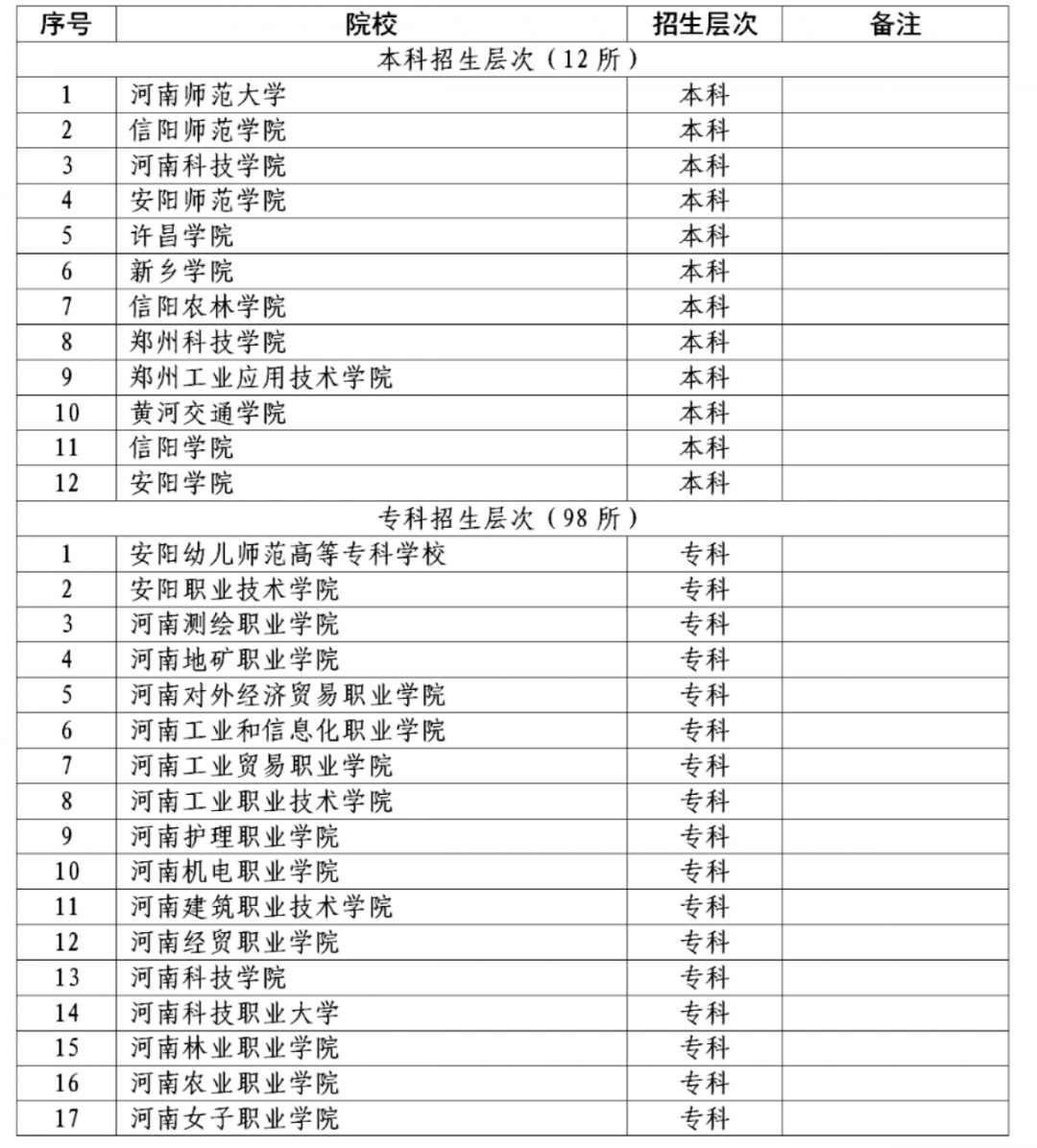 河南省2022年对口招收中等职业学校毕业生进入普通高等学校学习招生学校总表