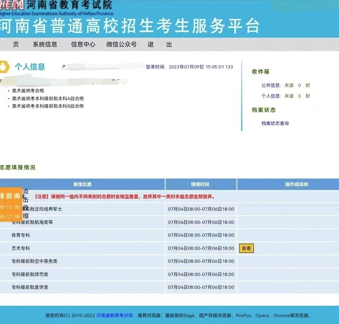 应该在河南省普通高校招生考生服务平台中查询,报考批次未开始录取的,会显示档案状态为“自由可投”。