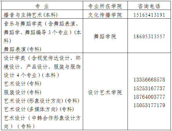 普通本科:播音与主持艺术、音乐与舞蹈学类(包含舞蹈编导、舞蹈学、舞蹈表演3个专业)、设计学类(包含视觉传达设计、环境设计、产品设计、服装与服饰设计4个专业);