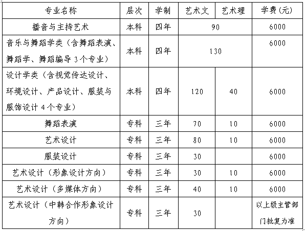 普通专科:舞蹈表演、艺术设计、服装设计、艺术设计(形象设计方向)、艺术设计(多媒体方向)、艺术设计(中韩合作形象设计方向)。