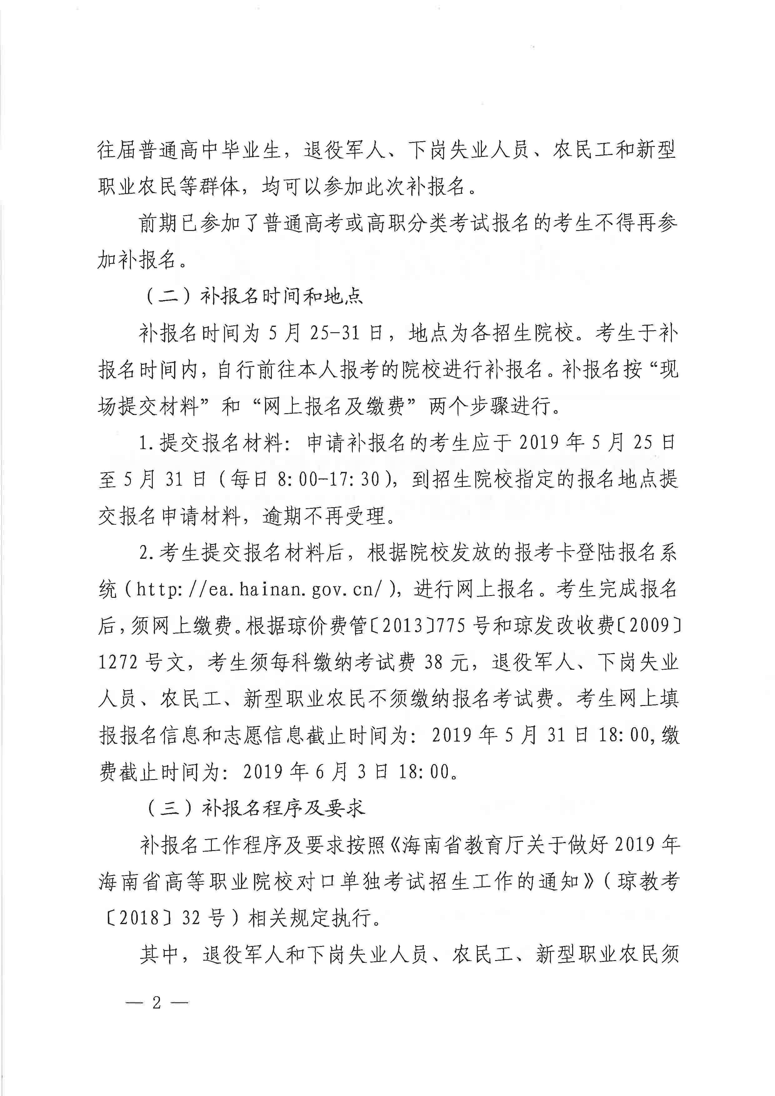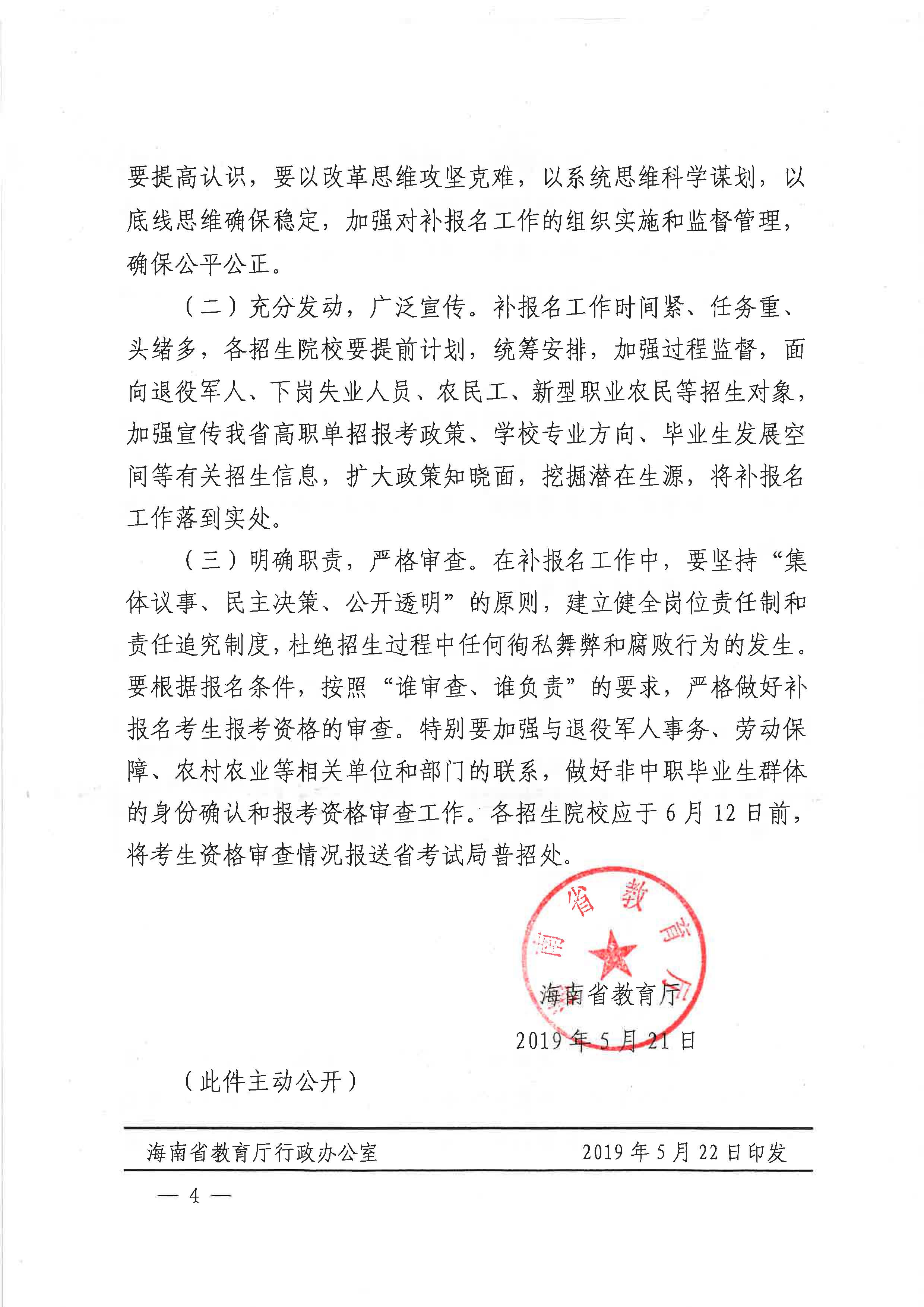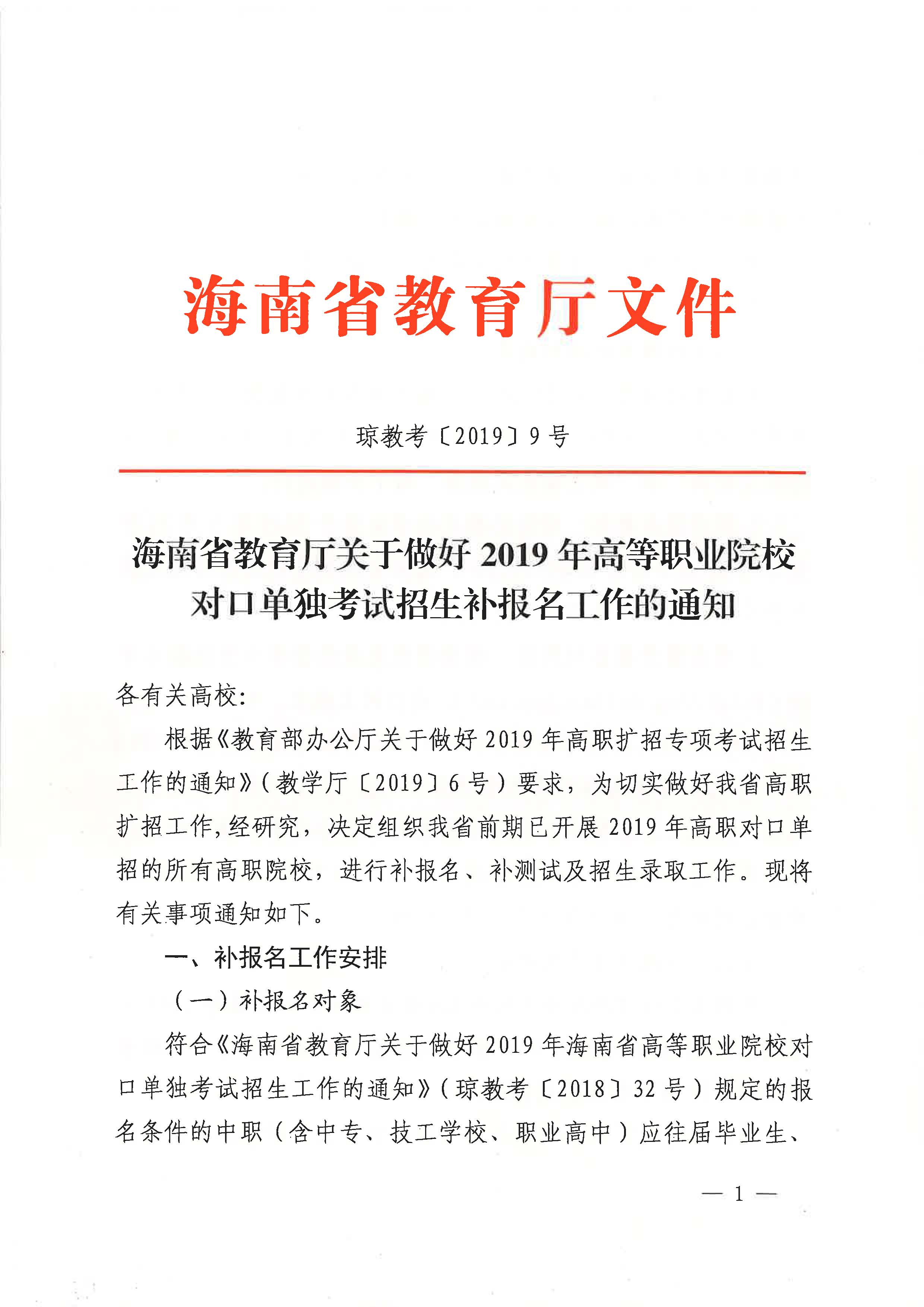 海南省教育厅关于做好2019年高等职业院校对口单独考试招生补报名工作的通知