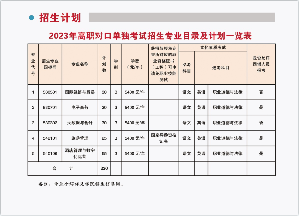 我校2023年高职对口单独考试招生专业目录及招生计划一览表