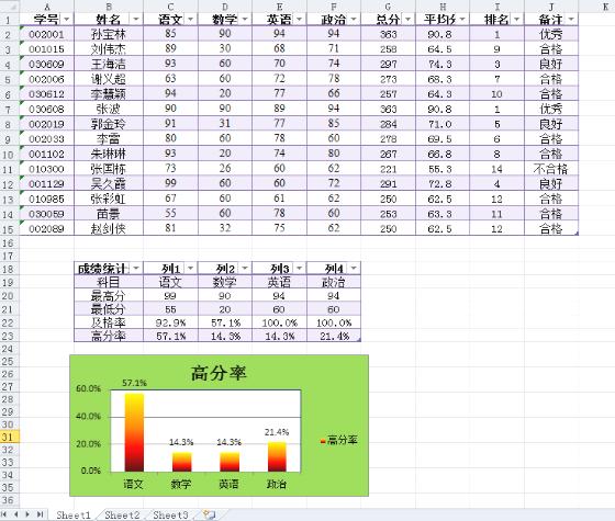 (8)将成绩表中的数据复制到sheet3中,利用分类汇总功能统计备注字段中各个等级的人数。(操作正确得分5分,满分5分)