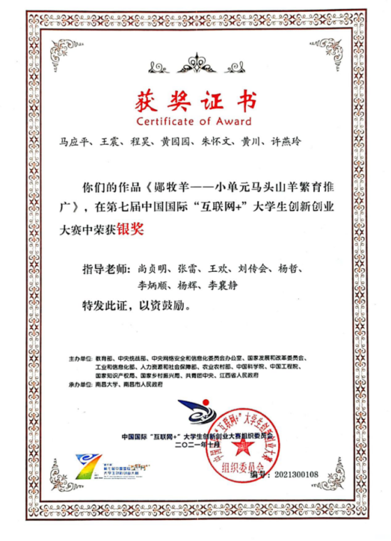 2021 | 《郧牧羊——小单元马头山羊繁育推广》,第七届中国国际“互联网+”大学生创新创业大赛 | 银奖 | |