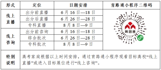 “线上咨询会”将在“育路通小程序”呈现。以云端平台链接全省高考家庭,打破时空限制,通过实时直播、动态视频、语音、文字及图片等方式,轻松获取各高校的招生政策、优势专业、办学内涵、人才培养模式等高招资讯,以云游校园的独特视角远程感受学校的学习环境和文化内涵。具体安排如下: