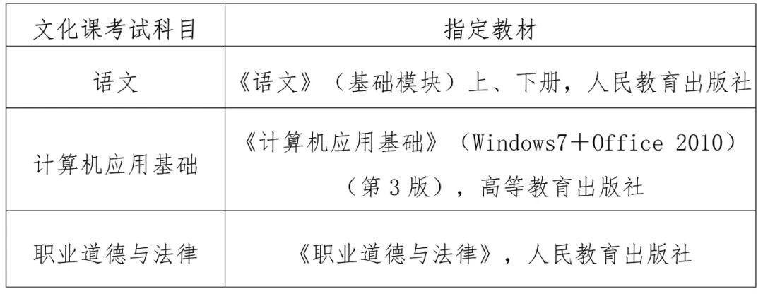 1.文化课考试方式。文化课采取笔试的考试方式,实行全省统一命题、统一考试、统一评卷,由省考试局负责组织实施。考试内容为我省中职学校所开设课程的基本知识,各科指定教材详见下表: