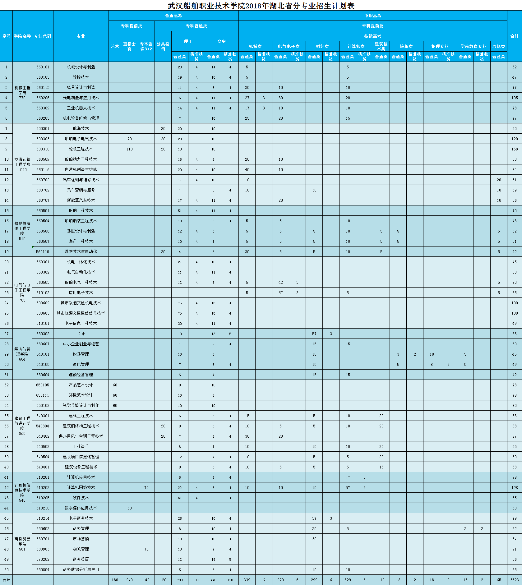 2018年湖北省分专业招生计划表