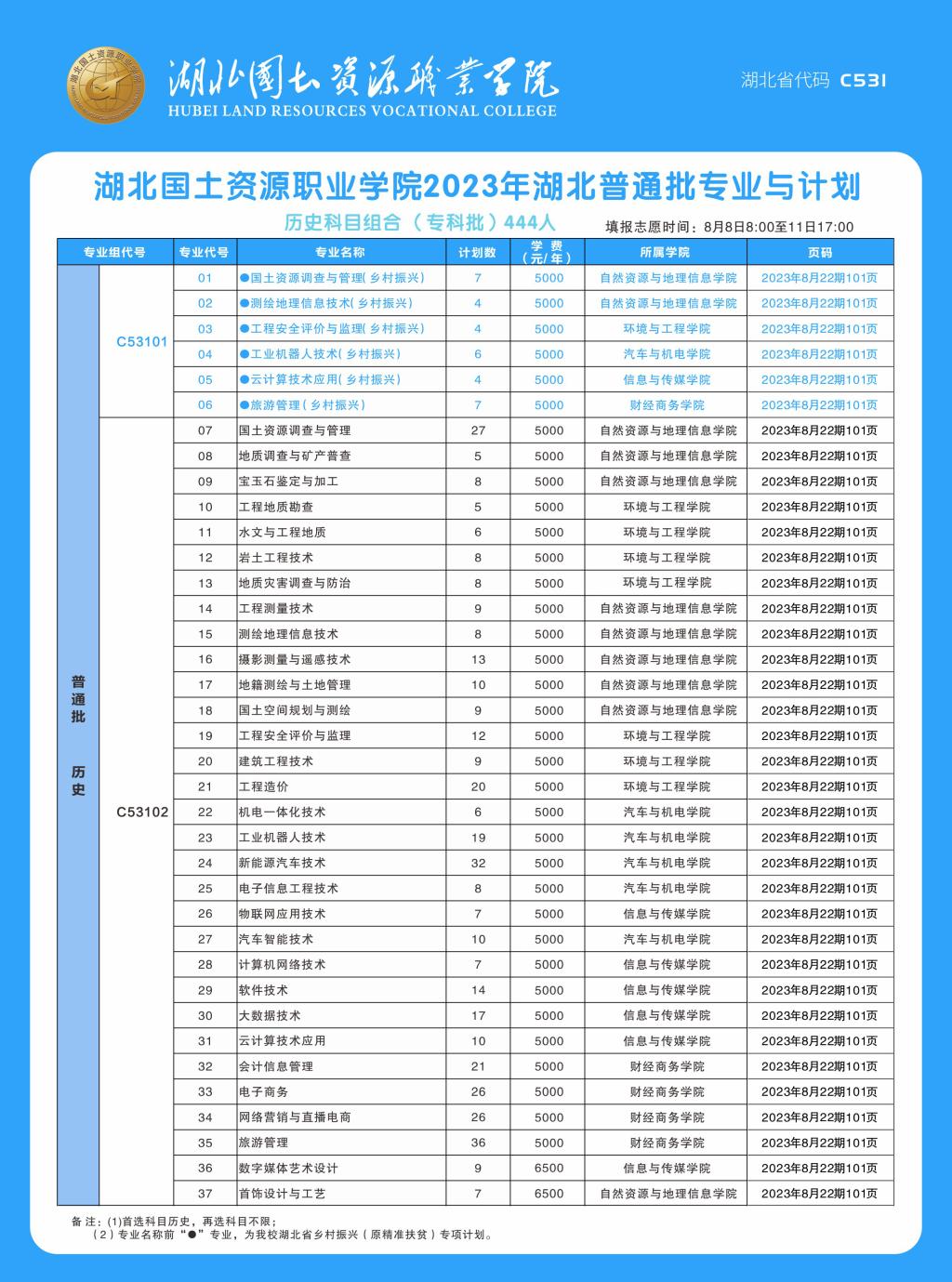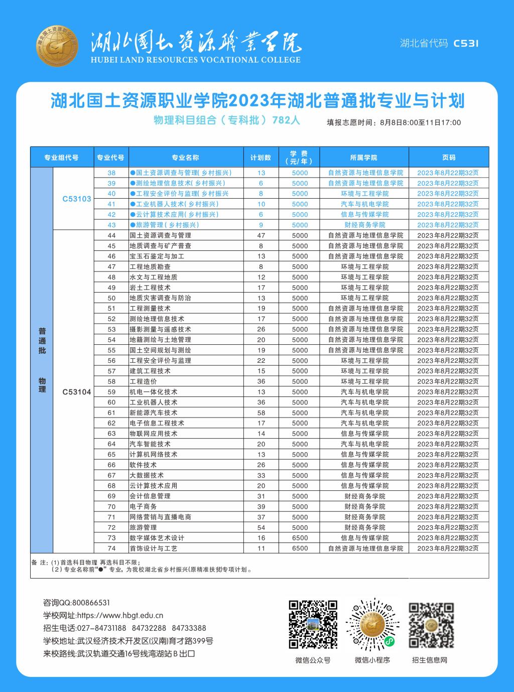 学校2023年湖北普通高考招生专业与计划