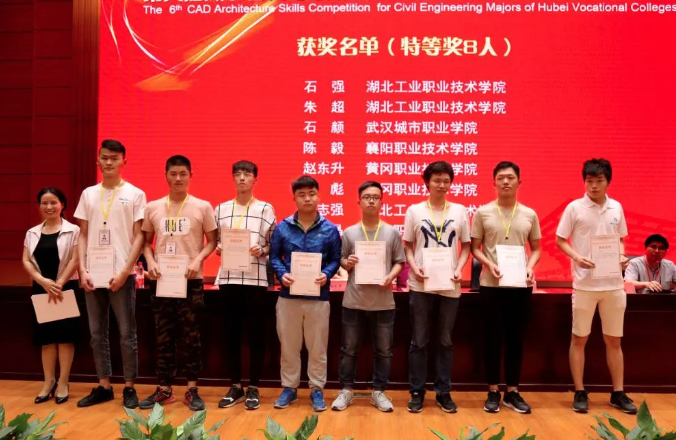 朱超(左三)在第六届湖北省高等职业院校土建类建筑CAD技能大赛中获得特等奖。